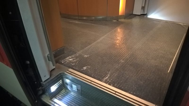 Wohl aus Gründen der potentiellen Verschmutzung durch übende Kräfte wurde der Zug in weiten Teilen (vollständig?) im Vorfeld mit Folien ausgelegt. Wenn man bedenkt, das die übenden Rettungskräfte im Rahmen ihrer Übung unter umständen durch Feld und Flur stapfen müssen und somit einiges an Schmutz unter ihren Schuhen mitbringen können, ist dies in meinen Augen nur verständlich.